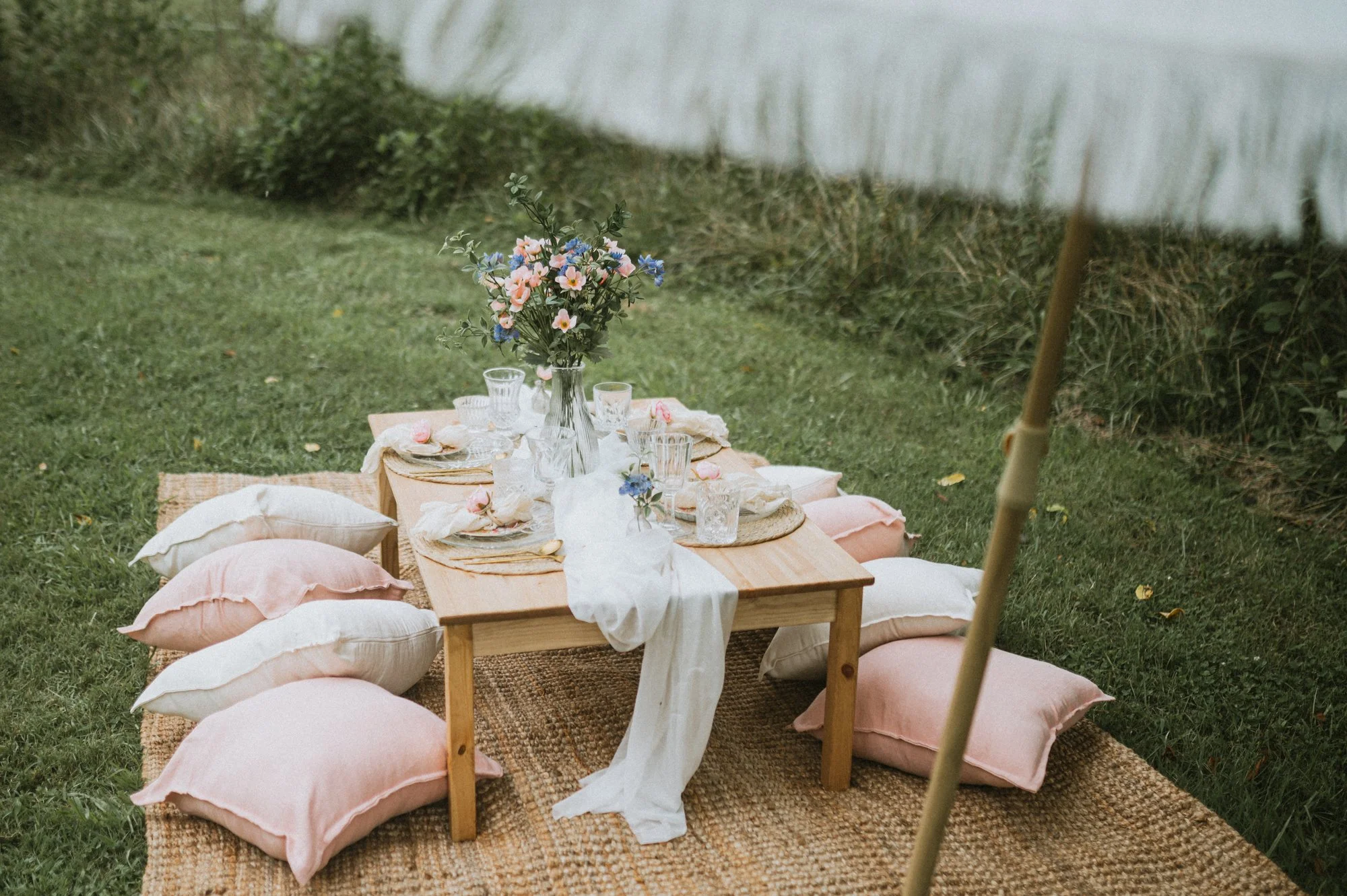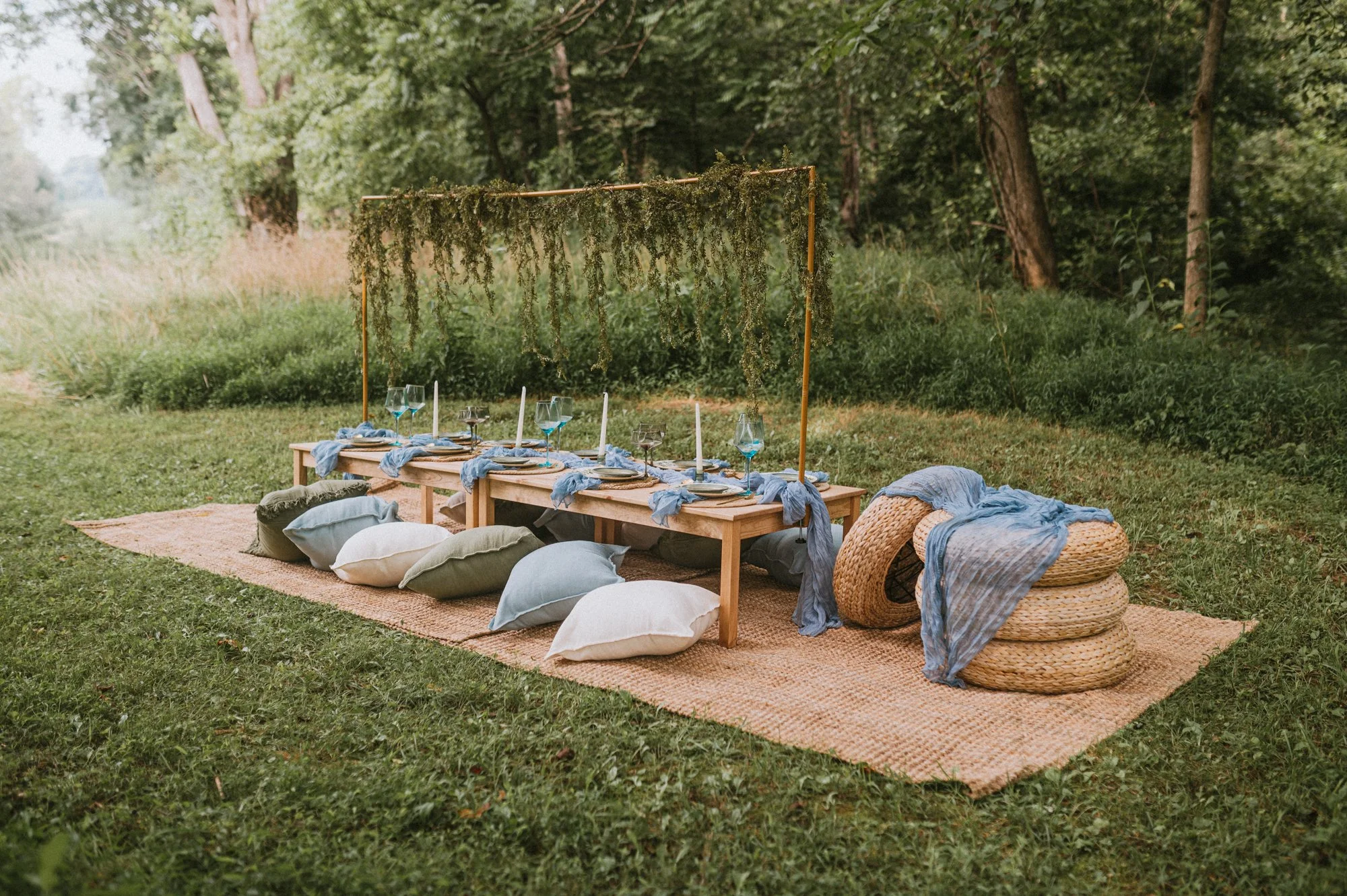 Blue Ridge is our signature setup inspired by the rolling hills, cool breezes, and timeless beauty of the mountains we call home. With a palette of soft blues, earthy greens, and natural textures, this setting feels fresh, grounding, and effortlessly elegant. Think wildflower touches, linen layers, and the kind of calm that only nature can provide. It’s perfect for those who want their gathering to feel peaceful, organic, and deeply rooted in the landscape.